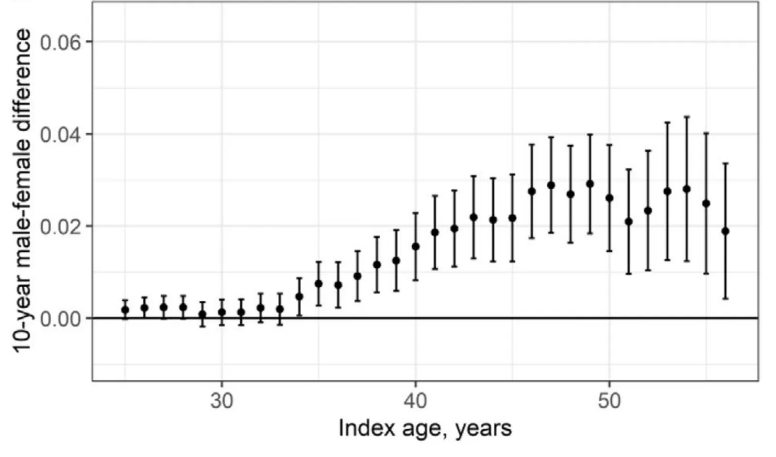 The gap is essentially zero through the late 20s. Around age 35, it begins to separate—and continues to widen through the 40s and 50s. By the late 40s, the excess 10-year risk for men is roughly 2–3 percentage points higher than for women.
